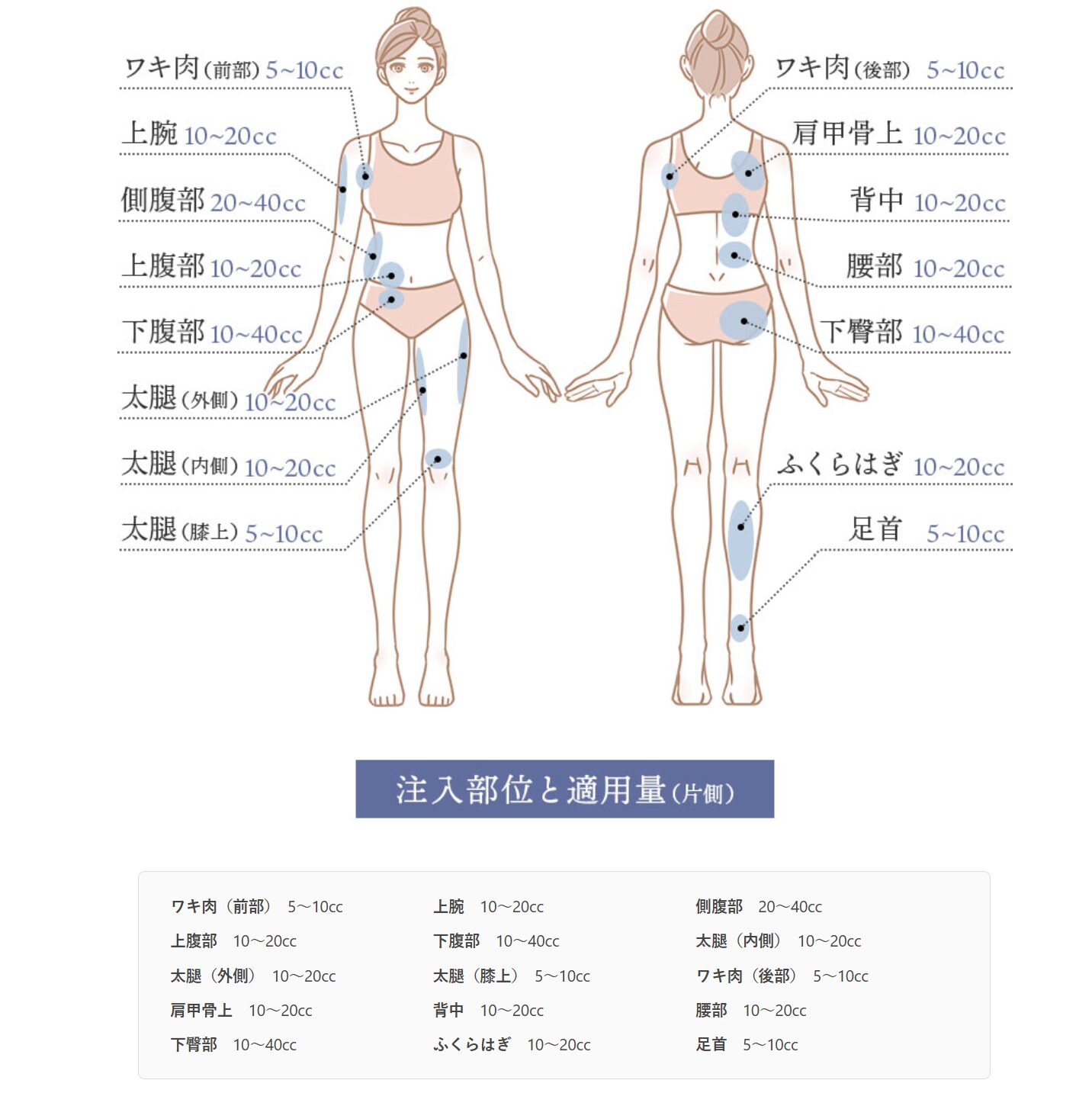 2) 体幹(ボディ)の注入部位と注入量の目安