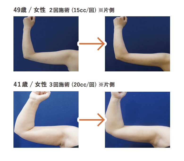 | 二の腕(両腕) | 10〜 20cc | 振袖部分を中心に注入 |