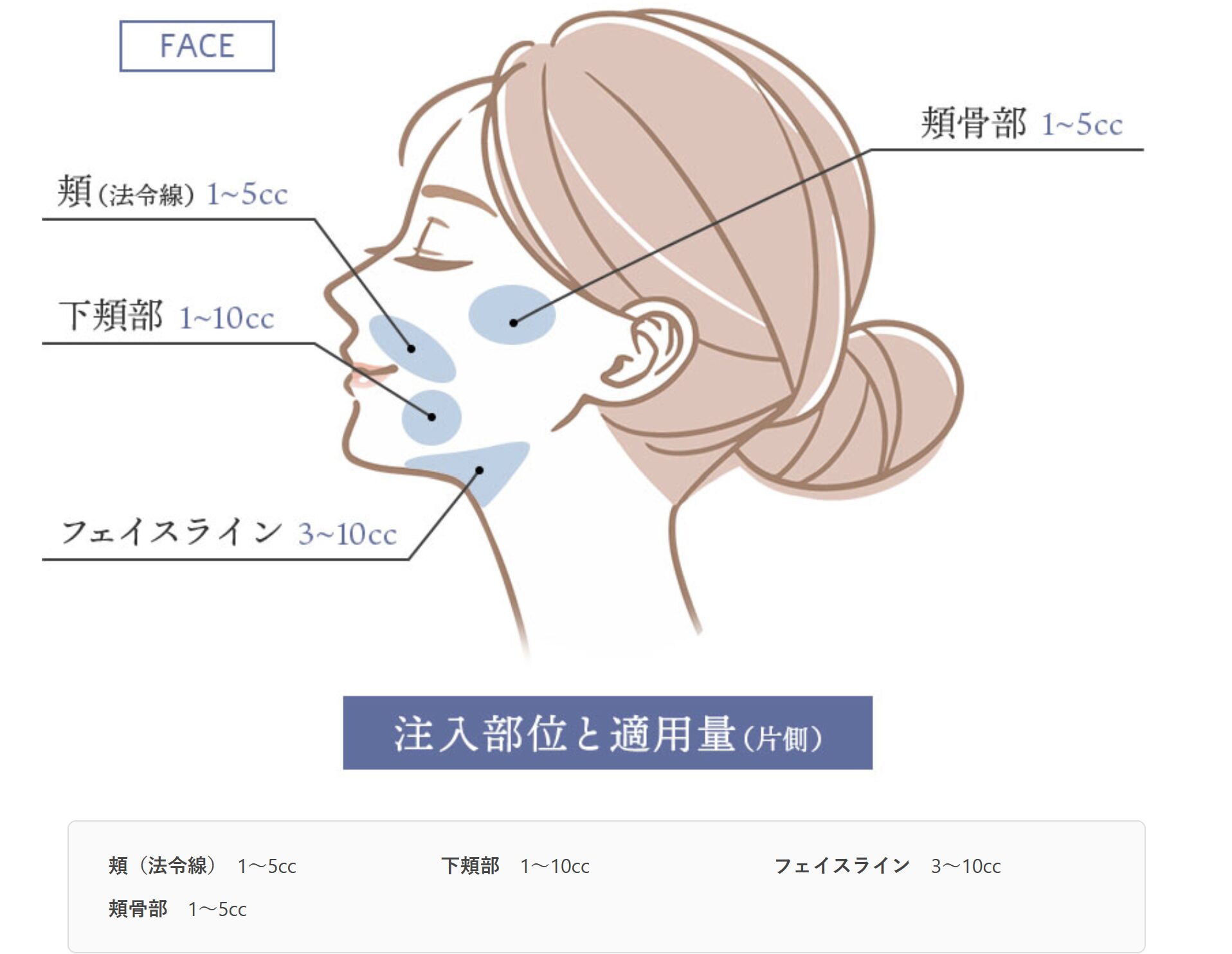 | フェイスライン | 2〜 5cc | 輪郭をハッキリさせ、小顔にする |