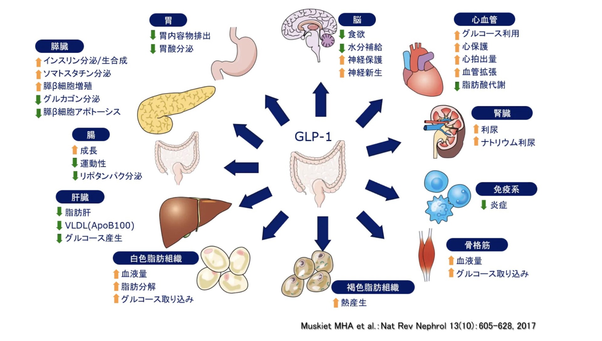 GLP-1は、食後の血糖上昇を抑制します。食べ物の胃から小腸への移動を遅らせることで胃に溜まりやすくなり満腹感が持続することで1回の食事量が減ります。また基礎代謝が上がり、太りにくい体質になります。免疫系や腎臓に働くことで余分な水分や塩分を排出させます。