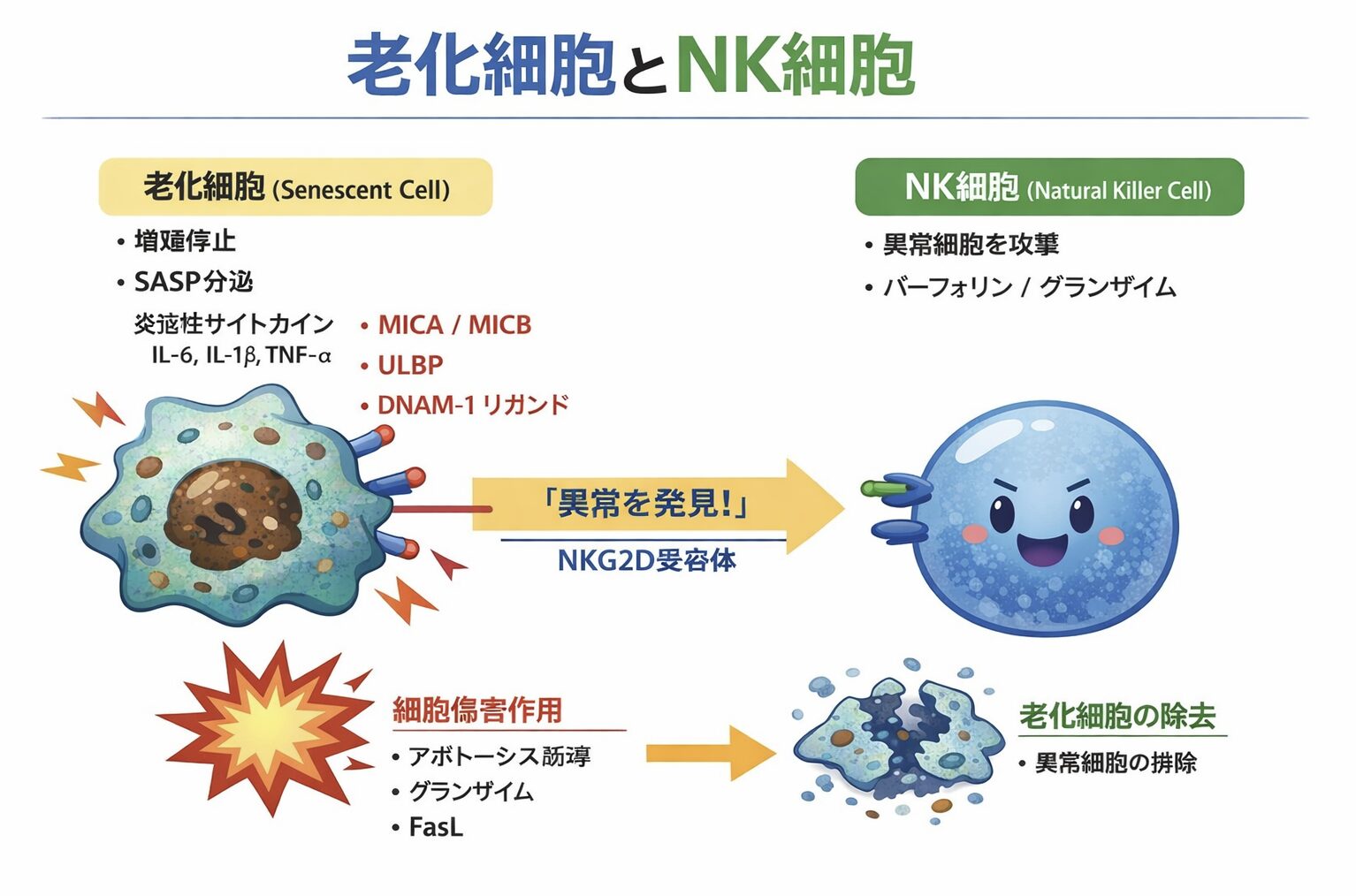 NK細胞治療は、がん細胞だけでなく老化細胞(senescent cell)の除去や制御にも注目されています。老化細胞はNK細胞に見つかりやすく、老化細胞表面にNKG2Dリガンド:MICA、MICB、ULBPなどが発現しておりNK細胞が結合し攻撃するため、活性化NK細胞を用いて、老化細胞を免疫的に除去し、炎症・線維化・加齢性疾患を改善する治療法です。