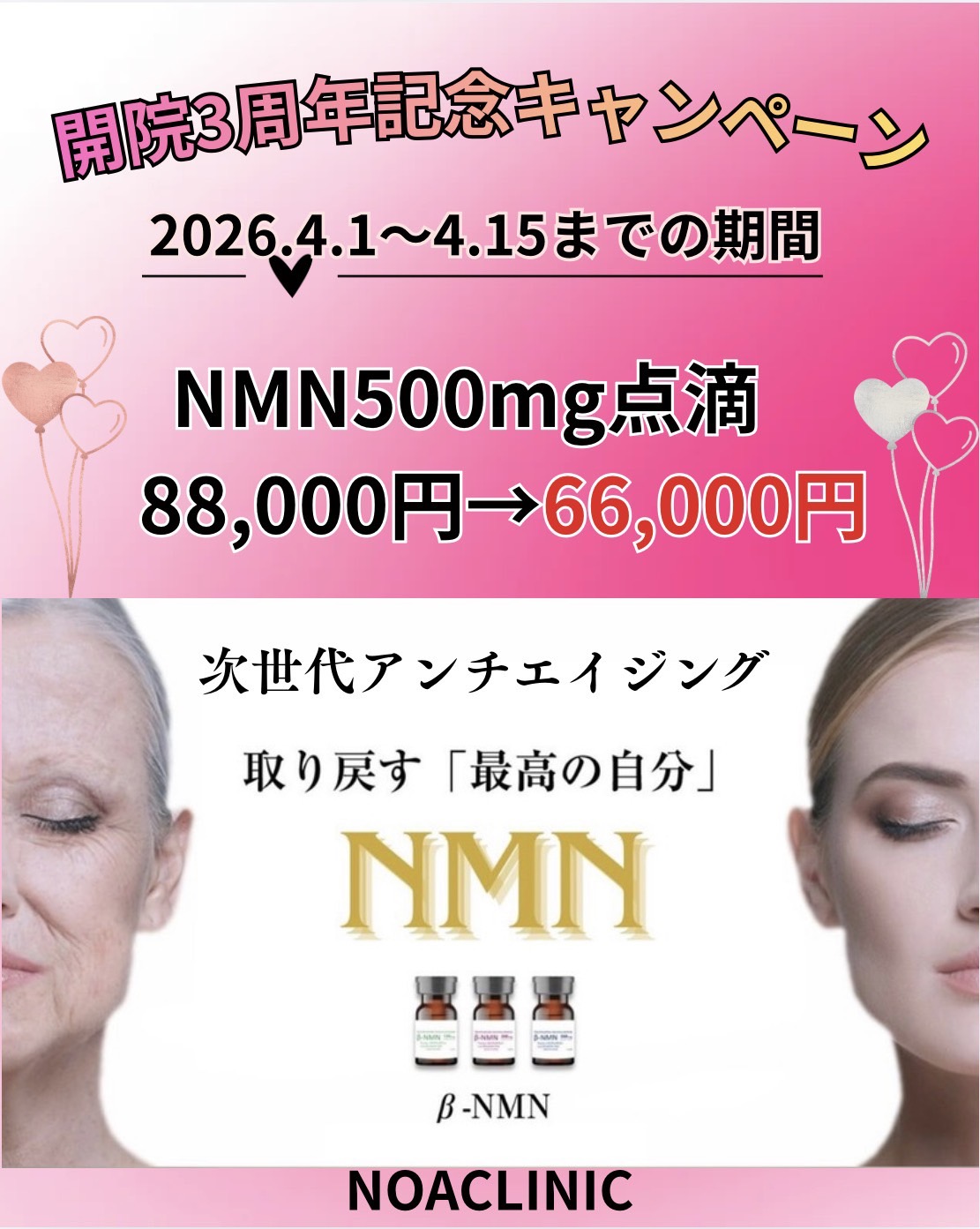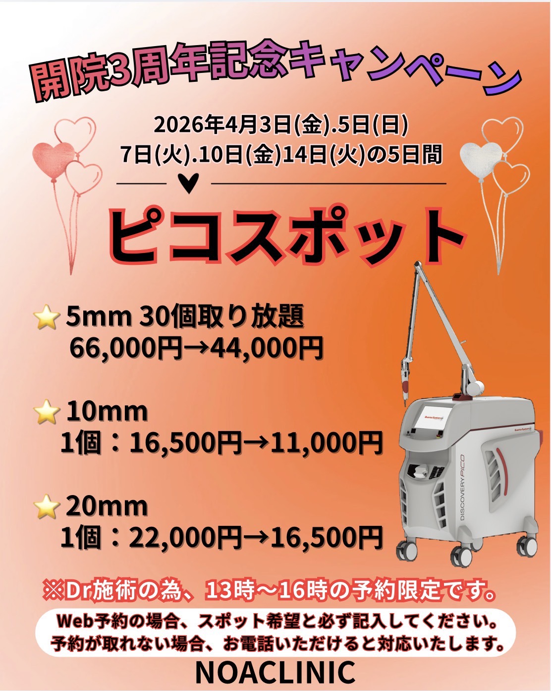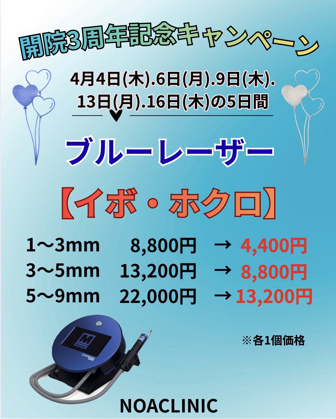 ピコスポットでのシミ取り、ブルーレーザーでのイボ・ホクロ取り、老化防止・疲労回復のNMN点滴をキャンペーン価格でご案内いたします。この機会にぜひご利用ください。