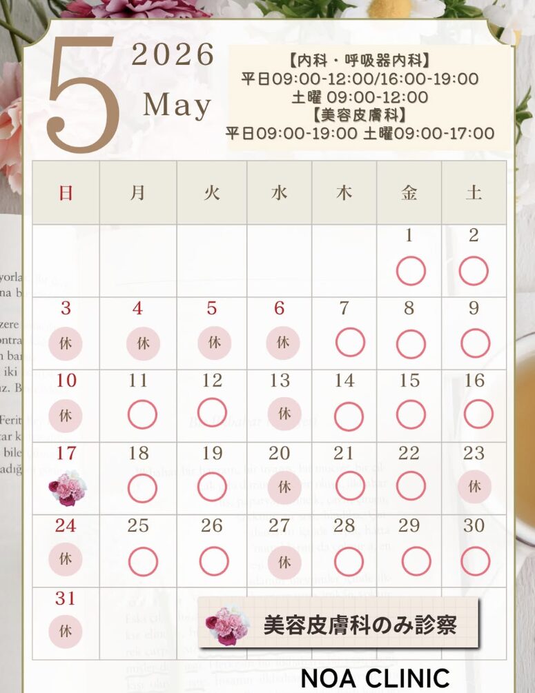 ノアクリニックです。5月の診療日のお知らせです。